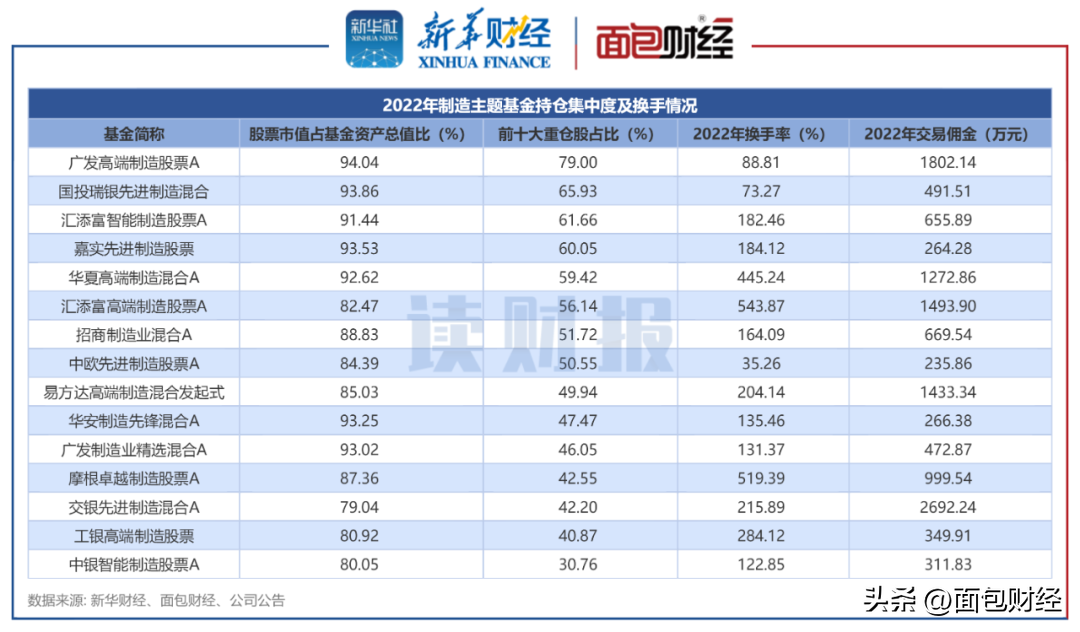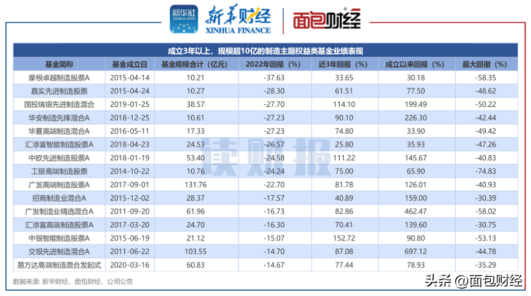 据不完全统计,全市场公募基金名称全称中包含“制造”这一关键词且2022年末规模超过10亿元、成立时间超过3年的主动权益型基金(包括偏股混合型、普通股票型、灵活配置型基金)共有15只(初始基金口径,下同)。
