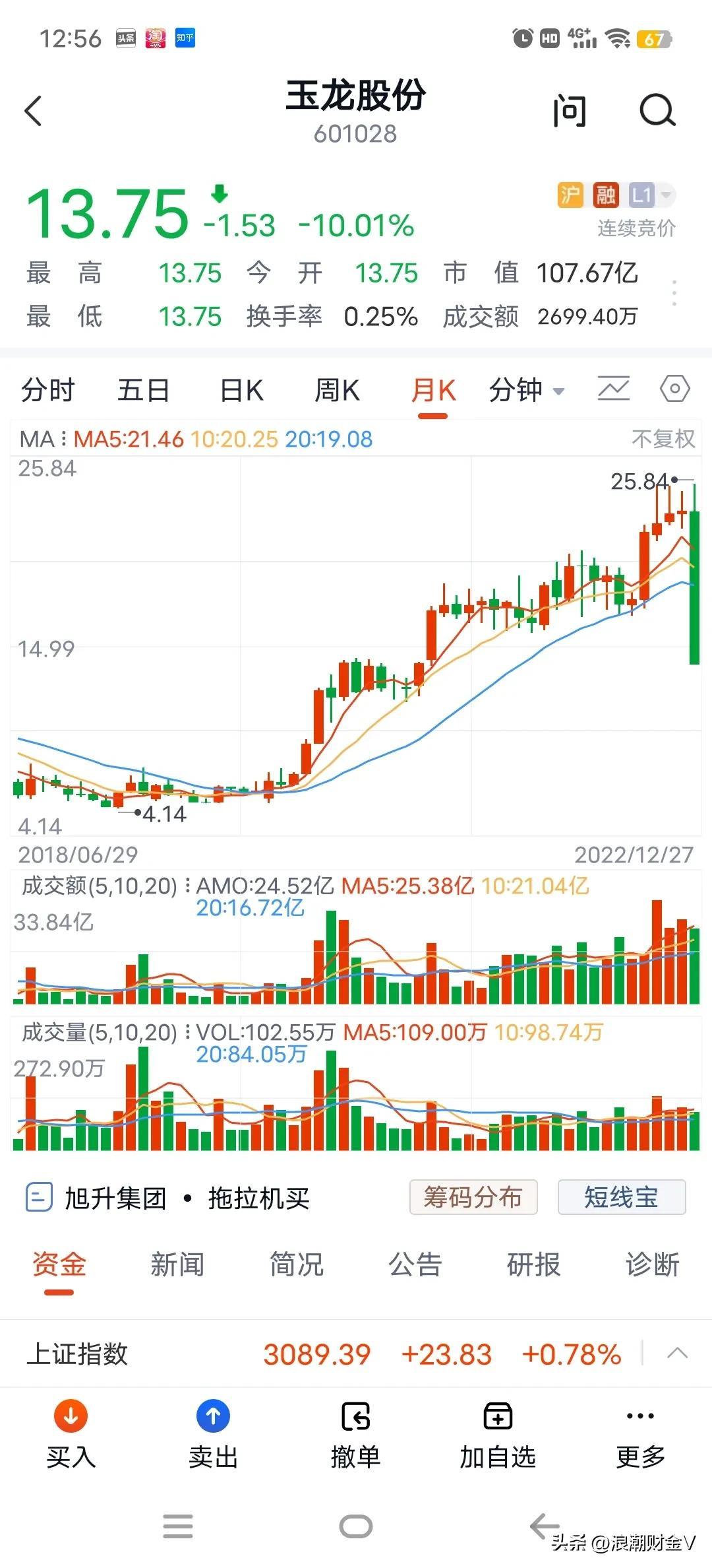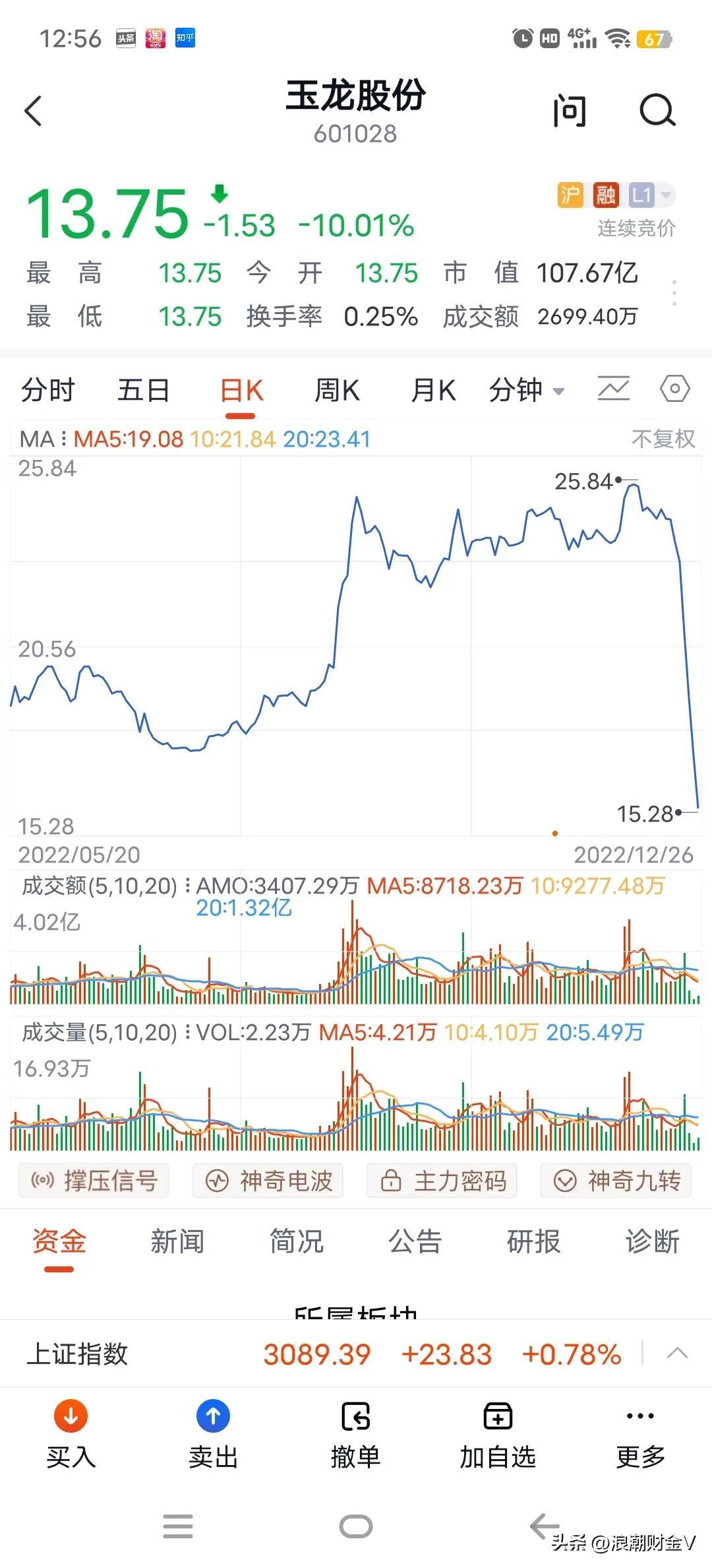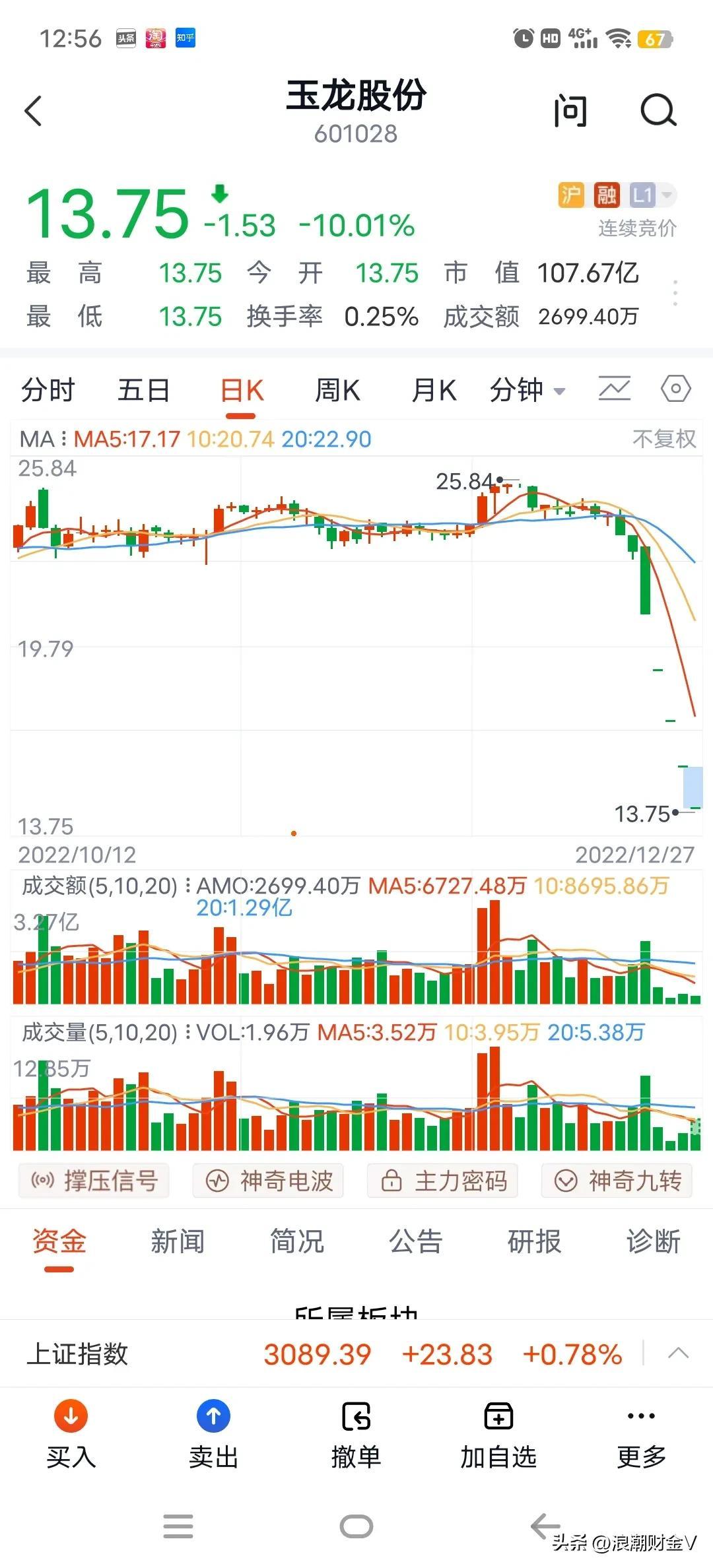 玉龙股份在市场上已经出现了连续五个跌停,特别是后四个跌停,出现了一字板的跌停,即开盘及跌停。