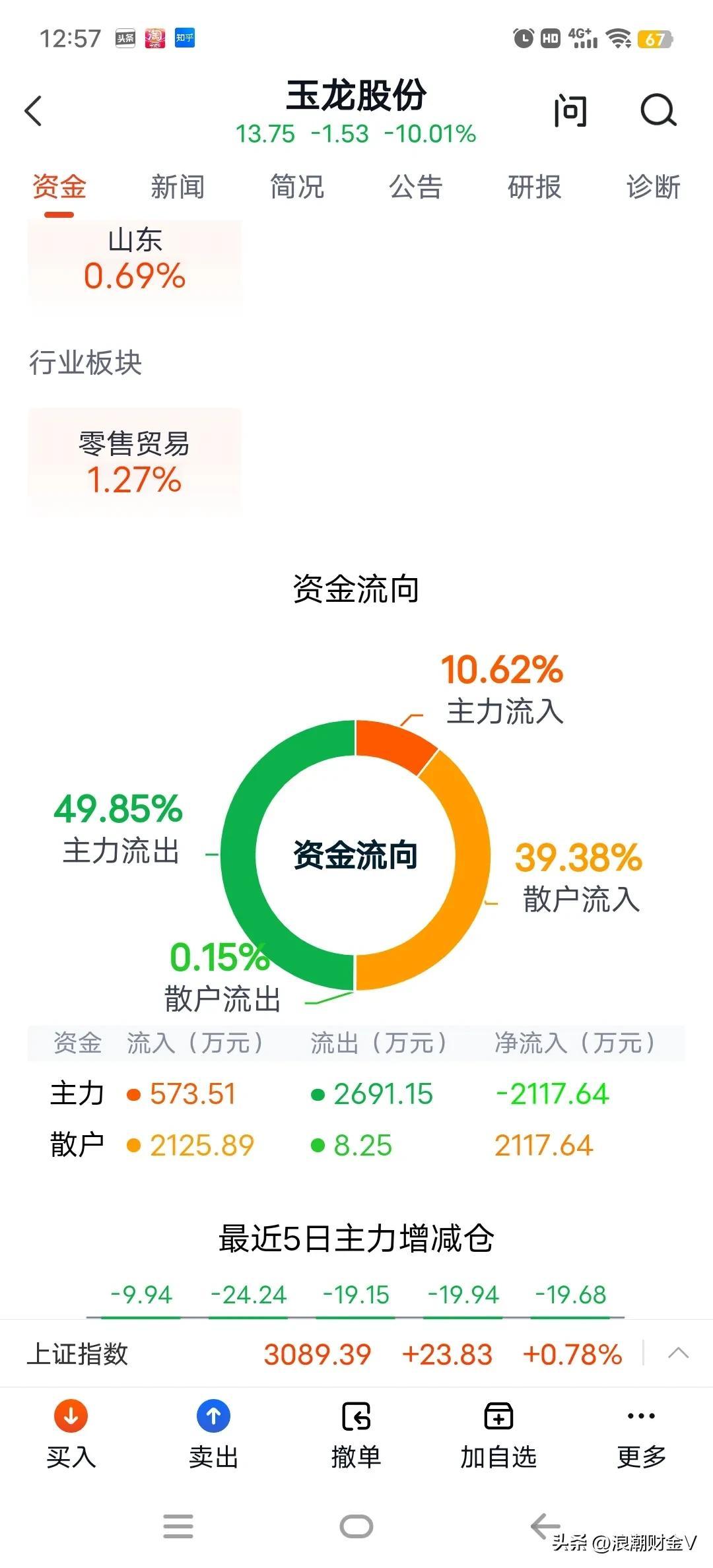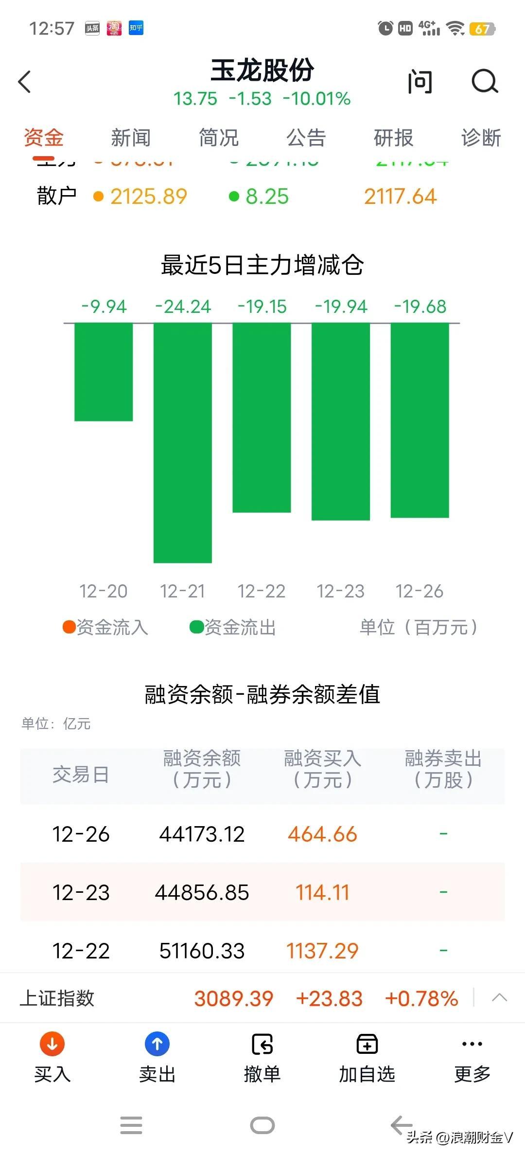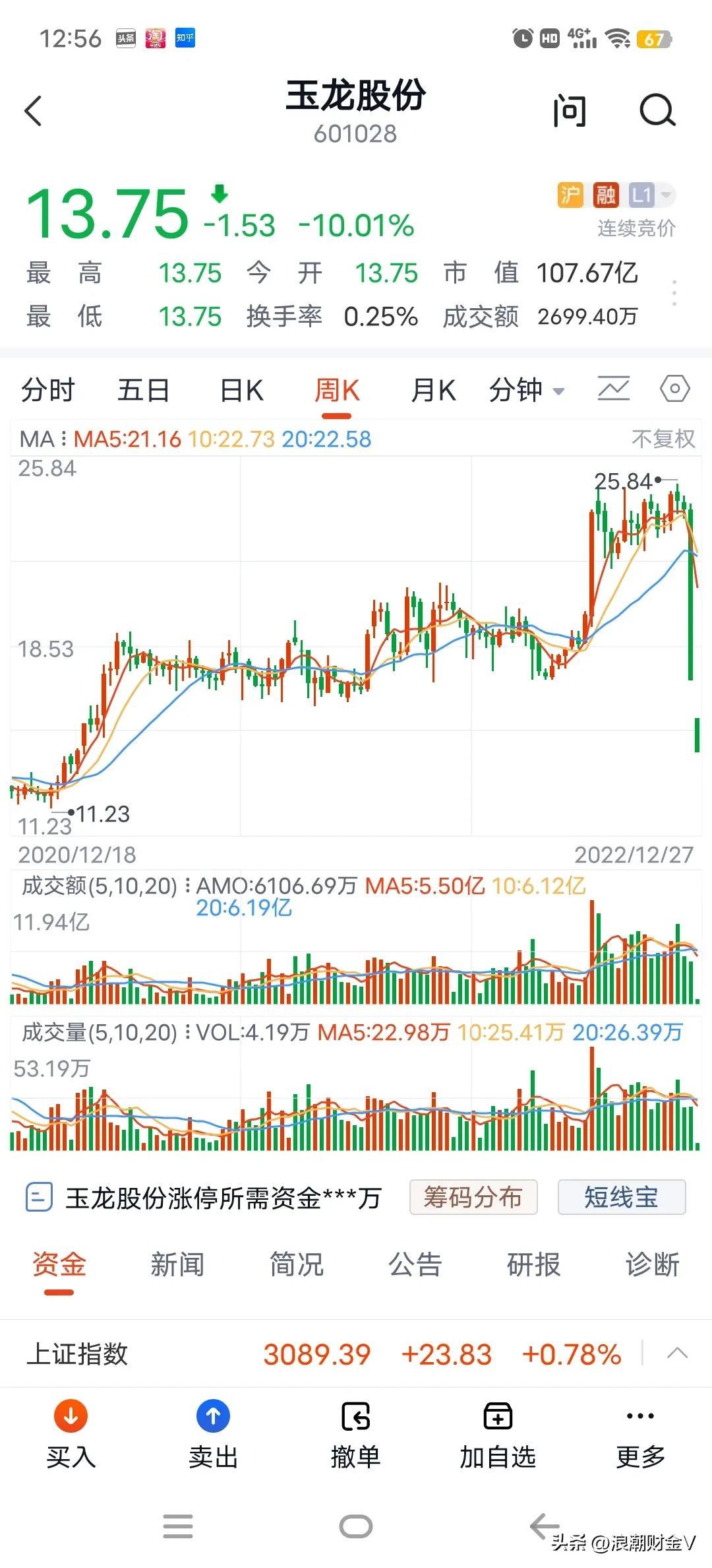 玉龙股份在市场上已经出现了连续五个跌停,特别是后四个跌停,出现了一字板的跌停,即开盘及跌停。