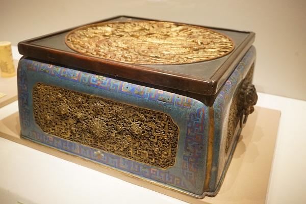一起展出的还有一个器形较大的掐丝珐琅蟠龙透雕宝相花兽耳冰箱。