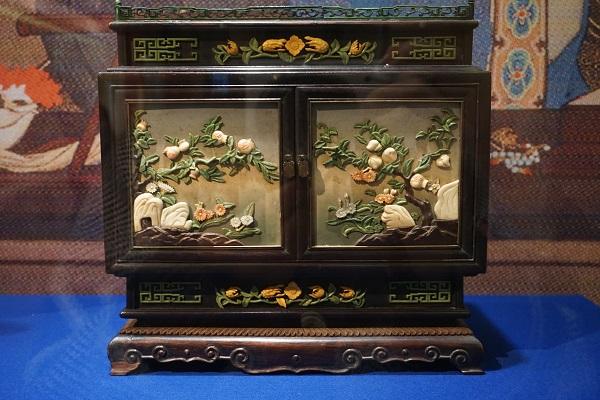 展览中也有一些供清宫后妃使用或赏玩的展品。如红木染牙三多花卉梳妆盒,此为清宫后妃使用的梳妆盒。盒身顶部饰绿色染牙围栏,镂雕勾莲纹;颈部与底部正面各镶嵌一株染牙佛手,其两边装饰染绿牙方形夔纹;中部为两扇红木方形门,门扇上镶嵌染牙石榴、仙桃及花卉图案,象征多子、多福、多寿;两个侧面镶嵌染牙山石、天竺、菊花、牡丹、水仙、桃花等四季花卉。整个梳妆盒用料名贵、工艺精湛、色彩雅致。