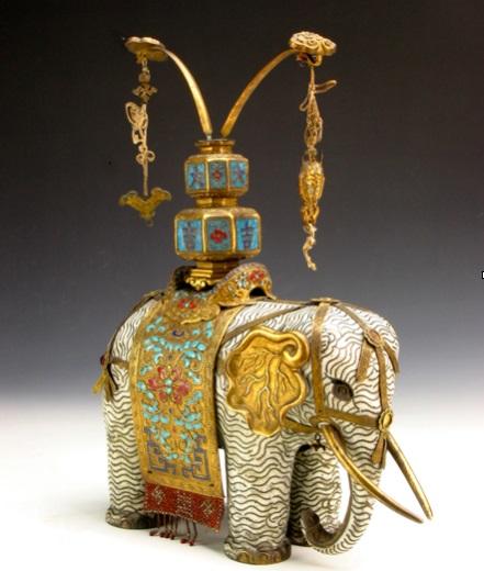 如掐丝珐琅象驮瓶。此为乾隆时期清宫陈设品,用以装点殿堂,寓意“平安吉祥”。此象俯首而立,长鼻微卷,神态生动;象牙、象耳均鎏金,象身以掐丝珐琅制横纹;象背驮八角葫芦式宝瓶,瓶壁四面嵌“大”“吉”文字;瓶口有鎏金如意头铜条二枝,悬系“磬”和“鱼”,寓意“吉庆有余”。