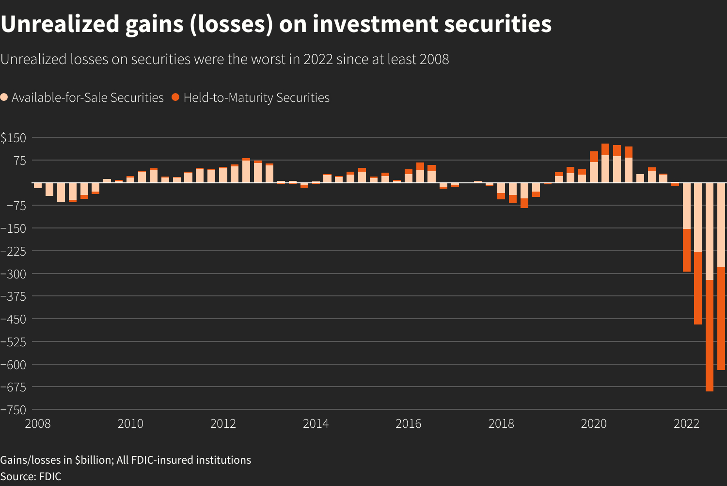 今年2月,联邦存款保险公司(FDIC)报告称,美国各大银行在可售证券和持有至到期证券上面临超过6200亿美元的未实现亏损。就在一年前,同样的账目亏损仅为80亿美元。