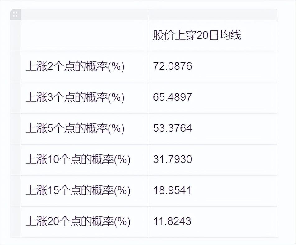 从上图中可以看出来,如果我的策略是在股价上穿20日均线后买入,那么在你持股的20个交易日之内,股价上涨2个点的概率有72%,其他涨幅以此类推。