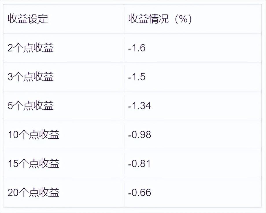 咋一看,虽然2个点的收益相对比较低,但是72%的比例还是比较高的,那是不是用2个点的收益率来做我们的收益点位,只要股价到达2个的收益率我们就卖出,是不是在股市里“躺赚”就稳如老狗呢。