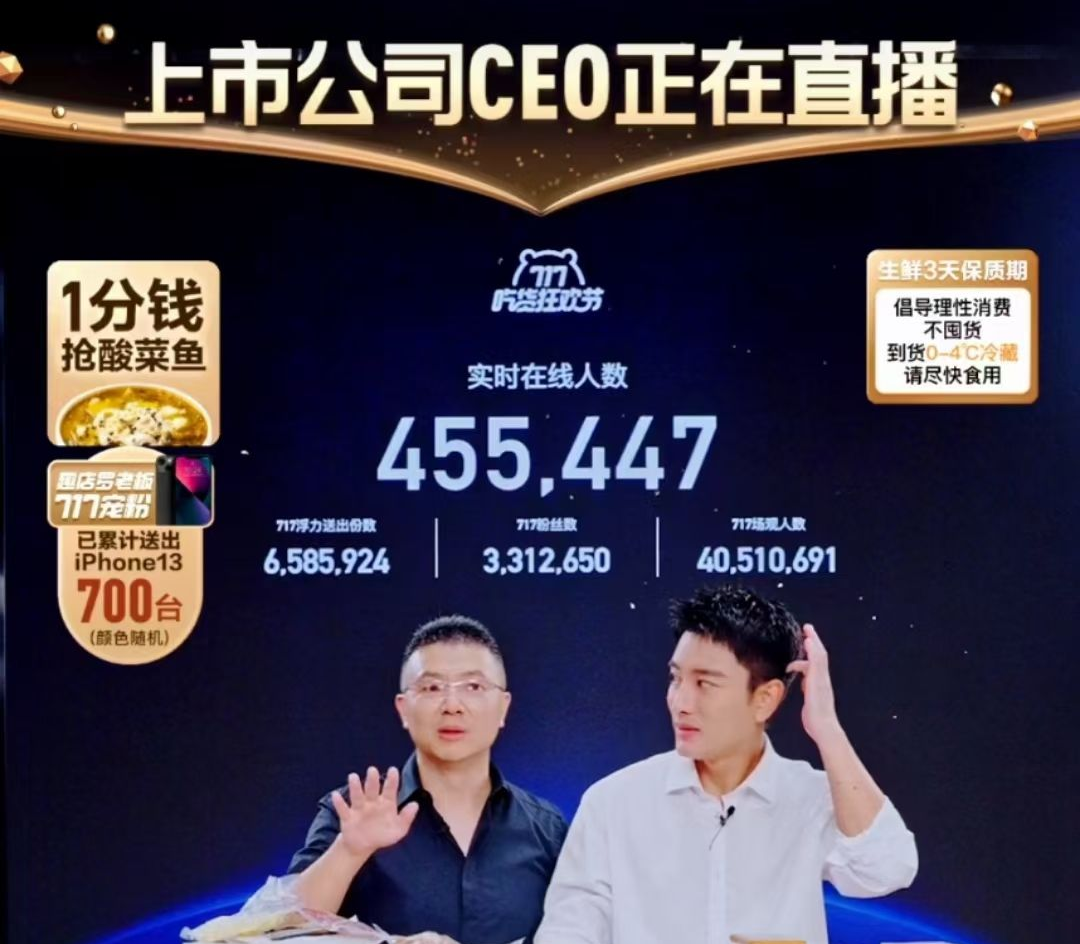 在今年七月,罗敏再度高调入局预制菜。凭借上市公司 CEO 直播带货的噱头和一分钱送酸菜鱼的优惠活动,趣店预制菜的抖音直播间吸引来了众多网友关注。根据蝉妈妈显示,当时罗敏直播间单场累计销售额达到2.5亿,累计观看人次达到9098.6万,累计点赞数6.44亿,单场直播销量达到863.1万,直播新增粉丝达458.3万。