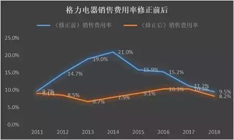 如果假设格力采取第一种、也就是相对保守的会计处理,将每年新增的销售返利都直接冲抵收入,我们可以推算出修正后的格力实际销售收入、收入同比增长率、毛利率、和销售费用率。