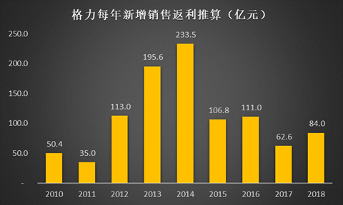根据老庞的推算,格力每年新增的销售返利主要发生在2012年至2016年,每年均在100亿元以上,其中2014年达到峰值233.5亿元。最近两年,新增销售返利则下降明显,均不足100亿元。