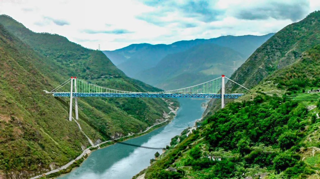 国内首座大跨径铁路专用悬索桥,全桥长882.5米,主跨达660米,跨越金沙江