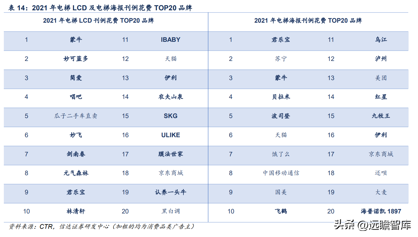 根据 CTR 数据显示,2021 年电梯 LCD 及电梯海报刊例花费的 TOP20 品牌榜单中消费品类客户占比都很高。