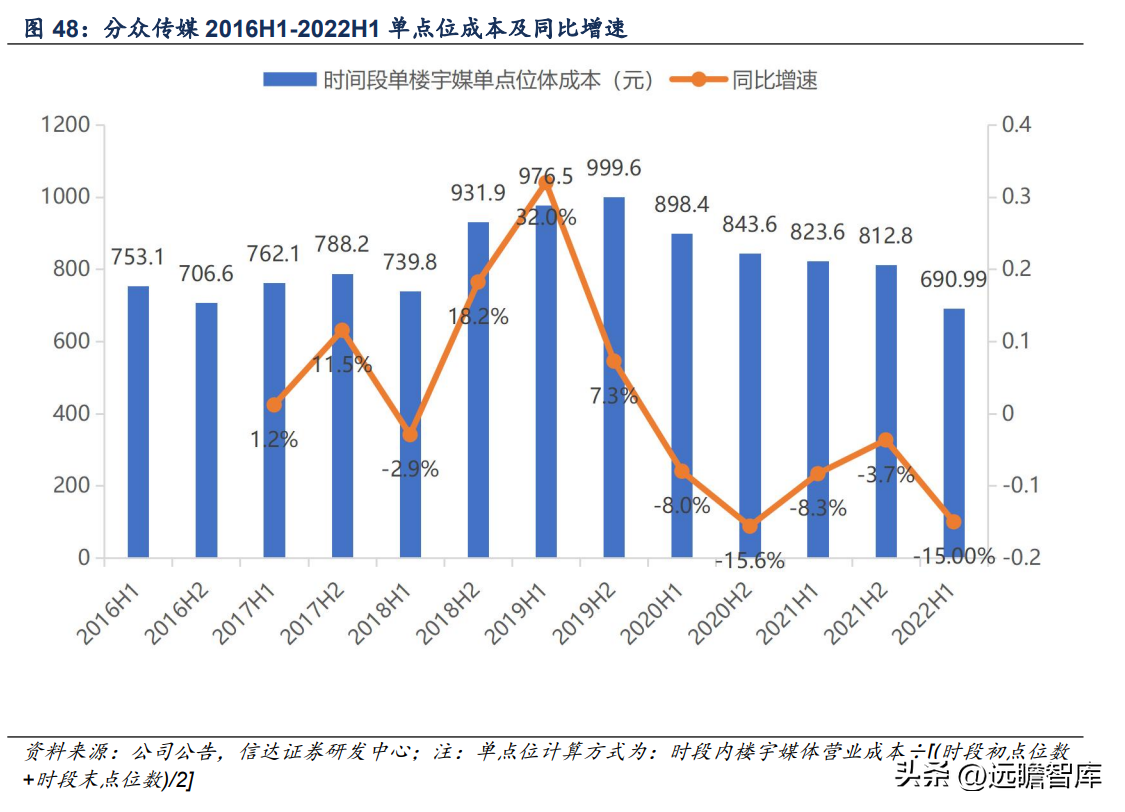 公司 2018 年大力扩张点位媒体资源以维持竞争优势,导致单点位成 本 2019H2 上升至平均近 1000 元。2019 年开始,公司便保持在增加优质资源点位的同时,优化和梳理楼宇媒体资源网络,剔除低效点位。其楼宇媒体单点位成从 2020H1 开始下降,2021H2 相较 2020H2 单点位成本下降了 3.7%。22H1 受疫情影响较严重,公司与物业管理部门商谈有望获得部分租金减免,我们预计 22 年整体单点位成本将继续降低。