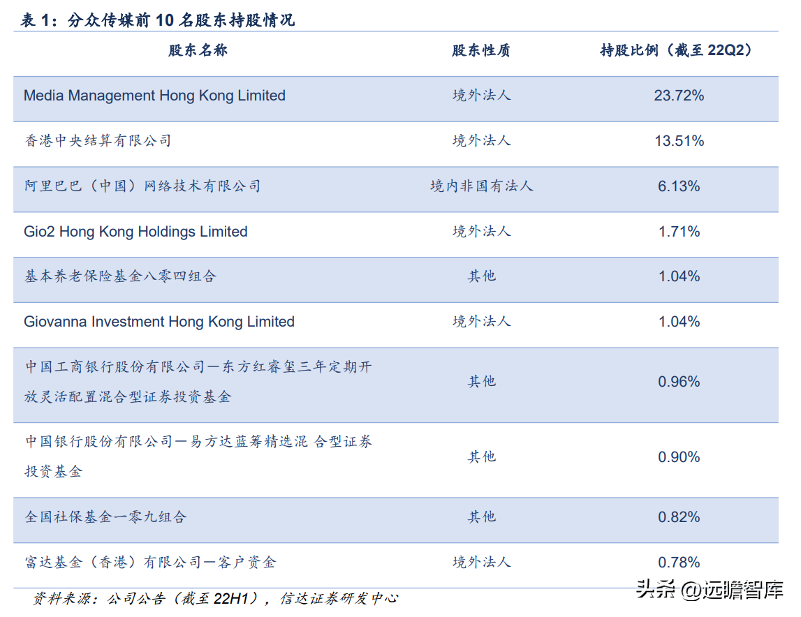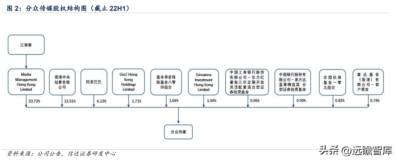 截至 22Q2,公司创始人、实际控制人江南春通过 Media Management Hong Kong Limited 持股 23.72%,为公司第一大股东。