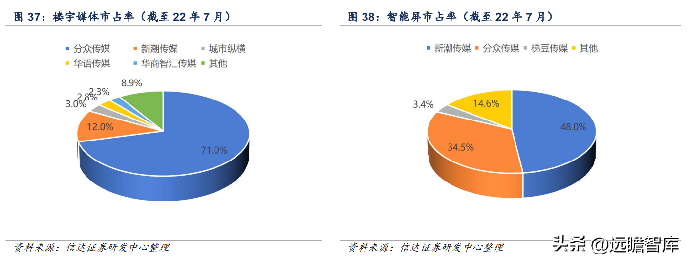 截止 2022 年 7 月,智能屏领域,分众以 34.5%的市占率排名第二,新潮传媒以 48.0%位居第一(新潮主要产品为智能屏)。