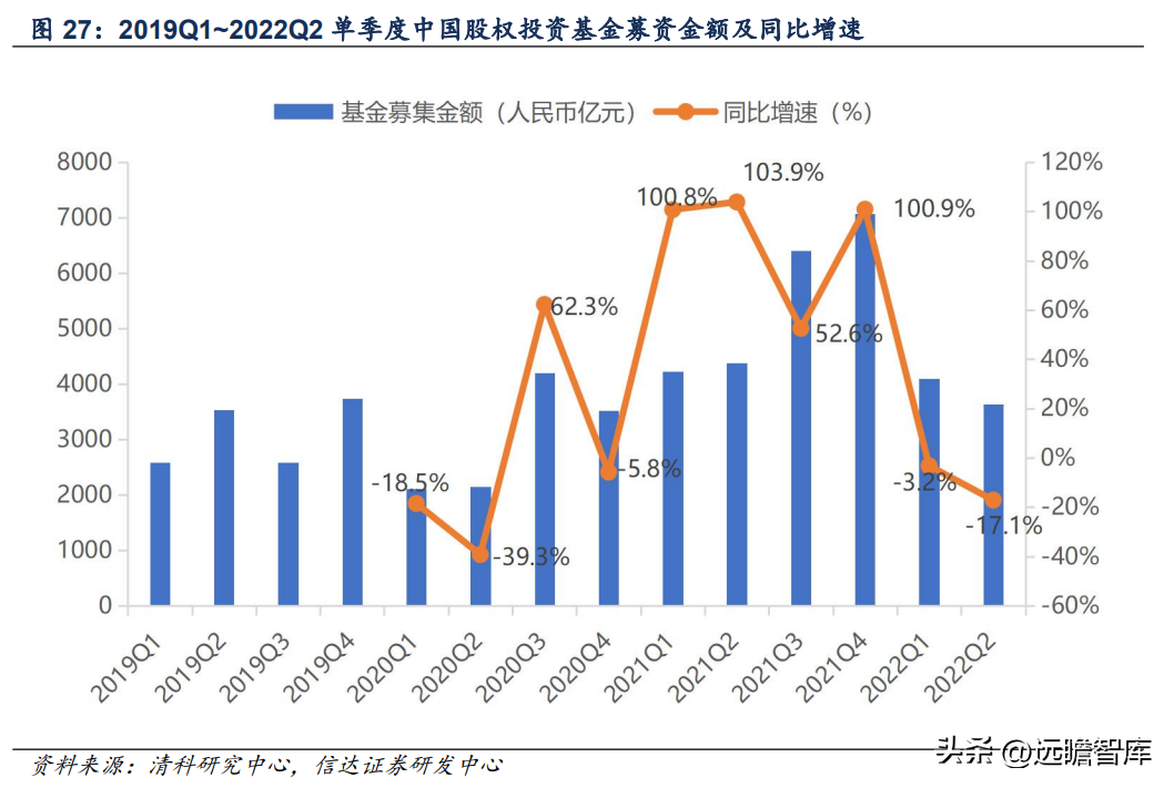 同时,从 2019Q1~2022Q2 中国股权投资基金募资各季度情况的数据也可以看到,尽管同 比情况类似的 20H1 时期下降幅度没有那么大,但整体中国股权投资市场投资步伐受疫情影响有变动。