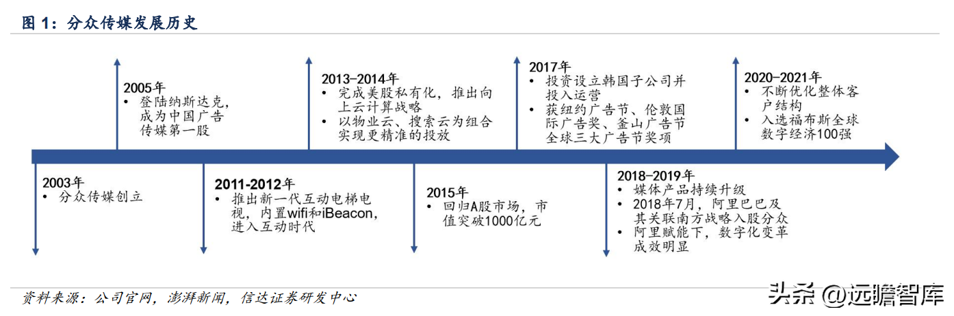 分众传媒成立于2003年,创立电梯媒体广告模式,于2005年成为首家在美国纳斯达克上市的中国广告传媒股,并于2007年入选纳斯达克100指数。