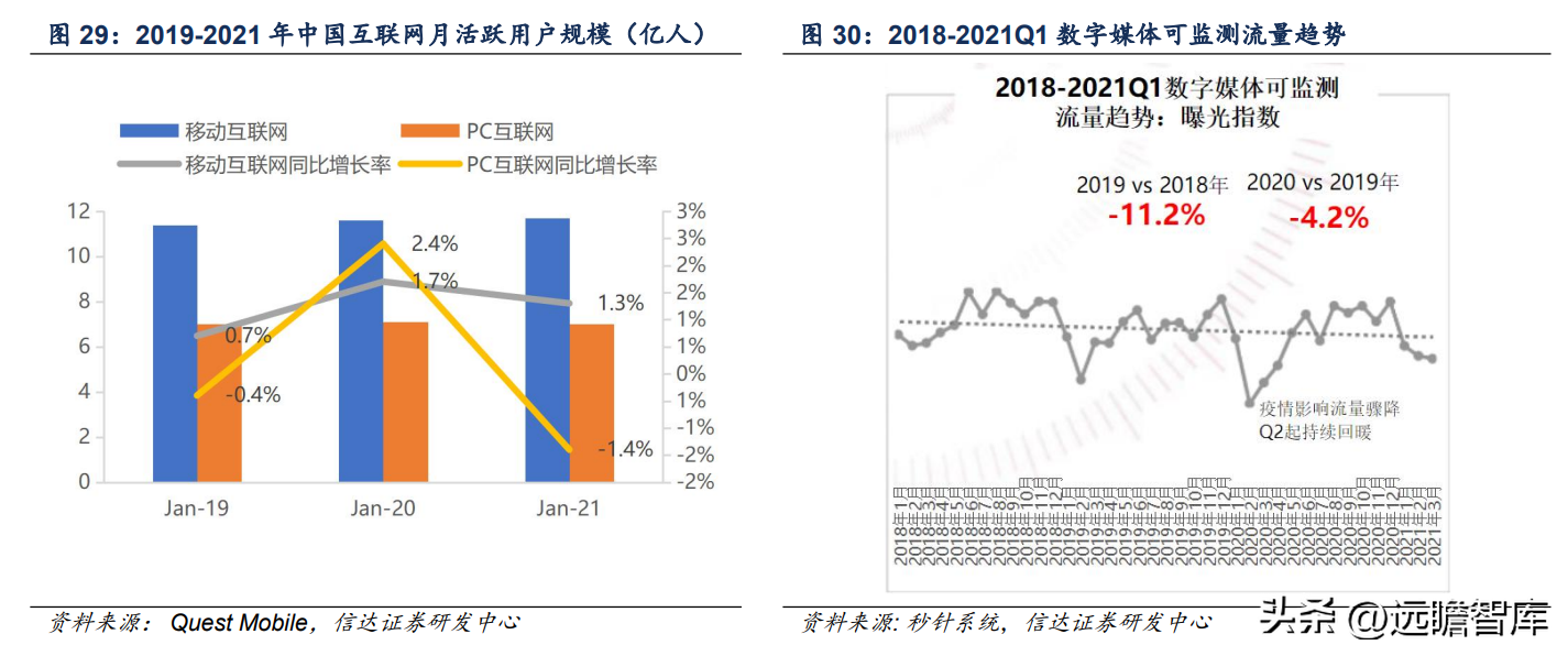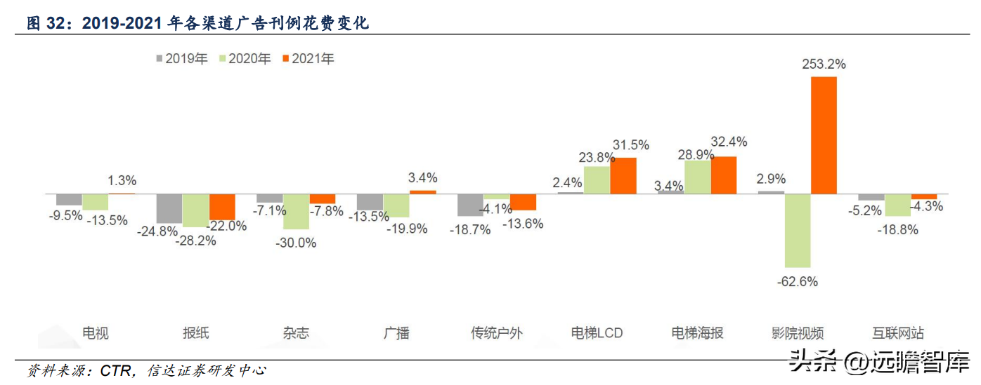 根据 CTR 数据显示,2019-2021 年疫情反复的环境下,只有电梯 LCD、电梯海报两类渠道始终保持同比正向增长,体现出“梯媒”的强劲韧性;21 年影院视频广告刊例花费同比增长高达 253.2%,主要系 20 年疫情期间影院全部停业,21 年疫情转好后重新营业;线上渠道电视、互联网站及其他传统媒体的广告刊例花费整体都是衰退趋势。