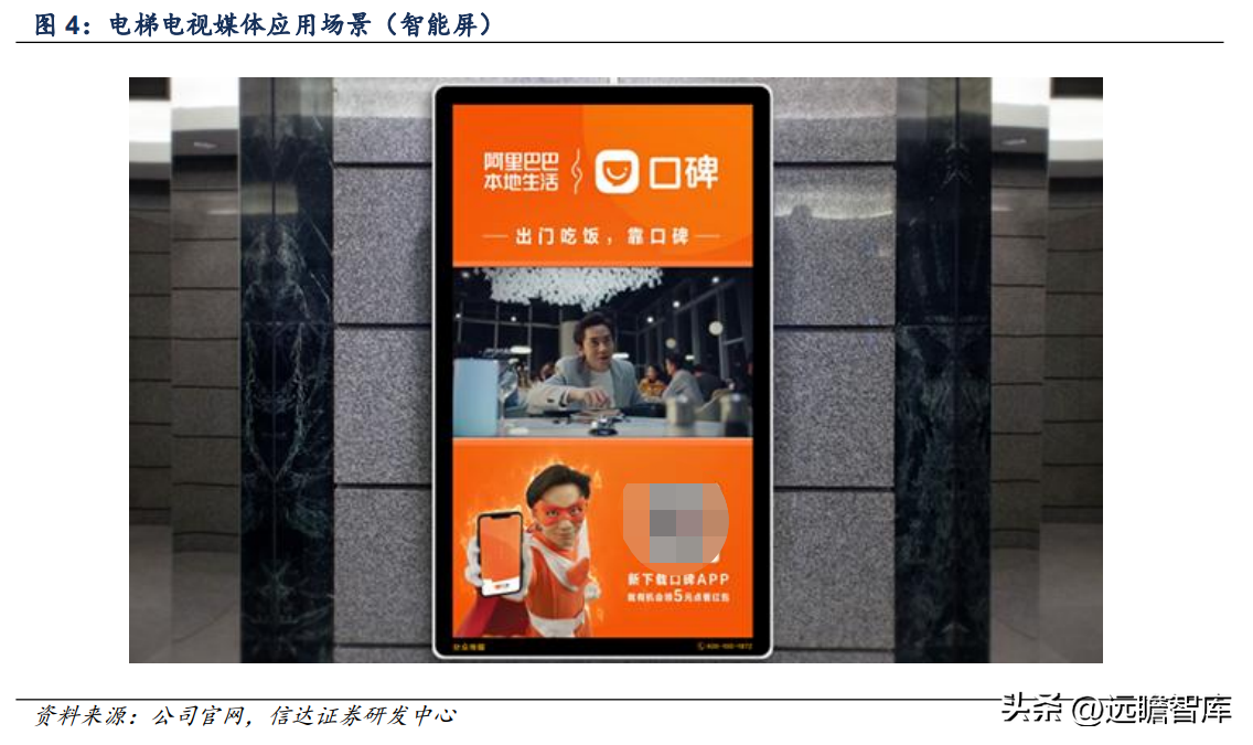 电梯电视媒体主要安放在电梯口,电视内容滚动循环播出。2018 年阿里巴巴战略入股分众 传媒后,分众数字化变革成效显著,实现了网络可推送、实时可监测、数据可回流、效果可评估。目前分众已从最早的插卡播放发展为大部分终端可云端在线推送,绝大部分屏幕物联网化,可以远程在线监控屏幕的播放状态。根据公司官网数据,分众电梯媒体日覆盖总人数超 4 亿。