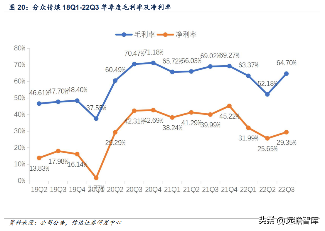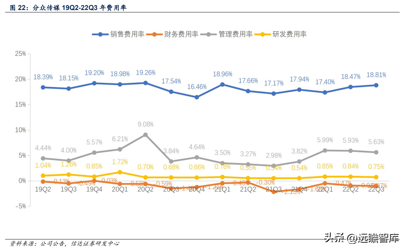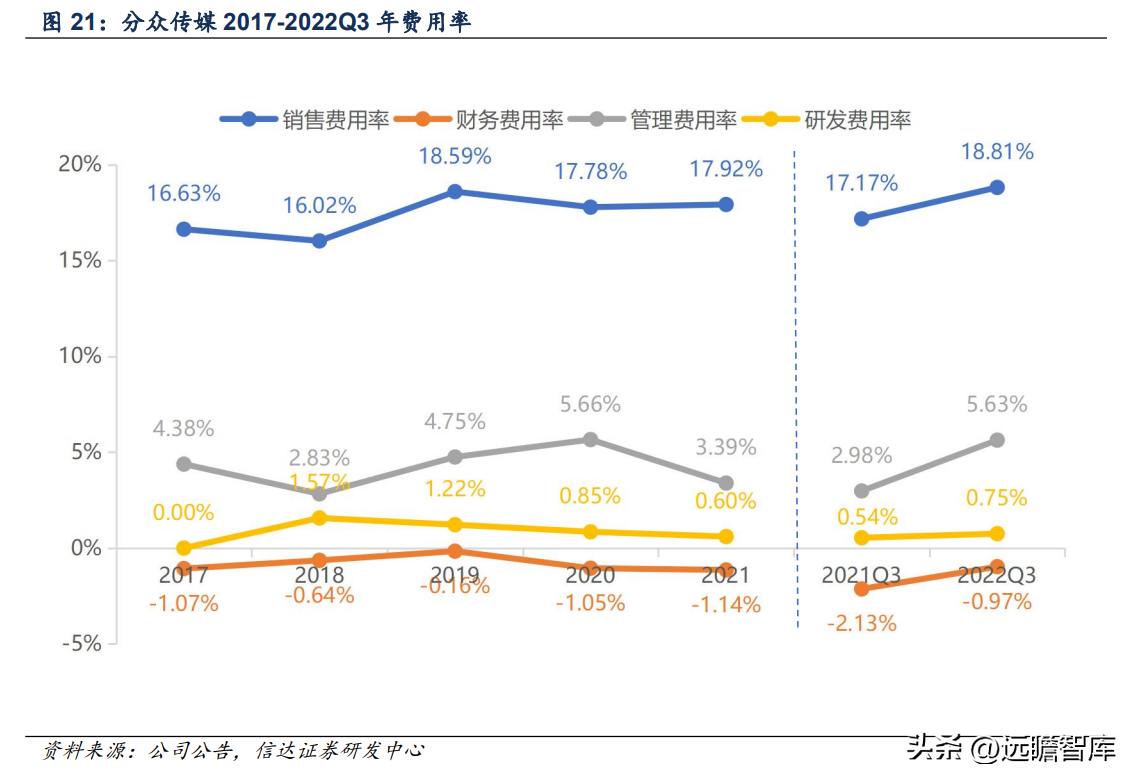20Q2 起毛利率快速回升,主要系公司抓住了新消费赛道高速增长的机会,众多品牌引爆案例不仅让公司在新消费行业的崛起浪潮中占据了十分重要的位置,也大幅提高了客户对公司的认同度,提升了公司媒体资源的整体刊挂率,因此公司楼宇媒体在一季度后表现出强劲的复苏态势。22Q3 同比整体毛利率、净利率大幅下降,主要系疫情影响广告市场承压,收入端下滑幅度大但租赁成本是相对固定的。