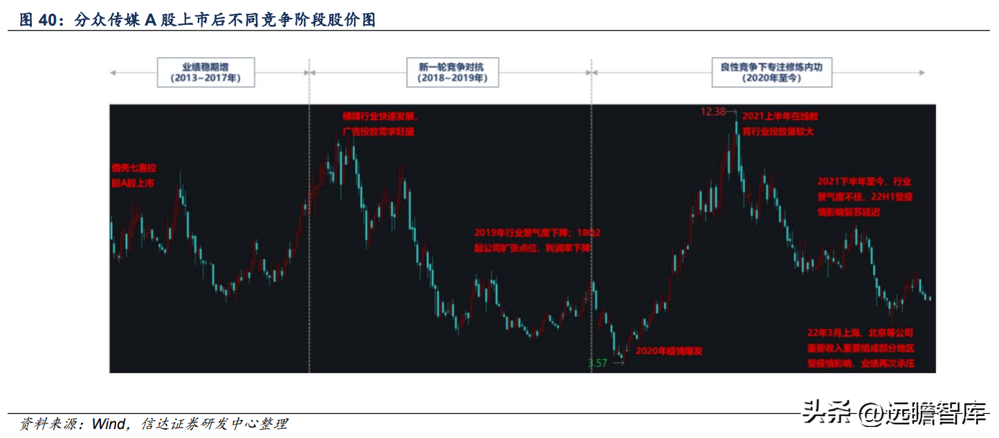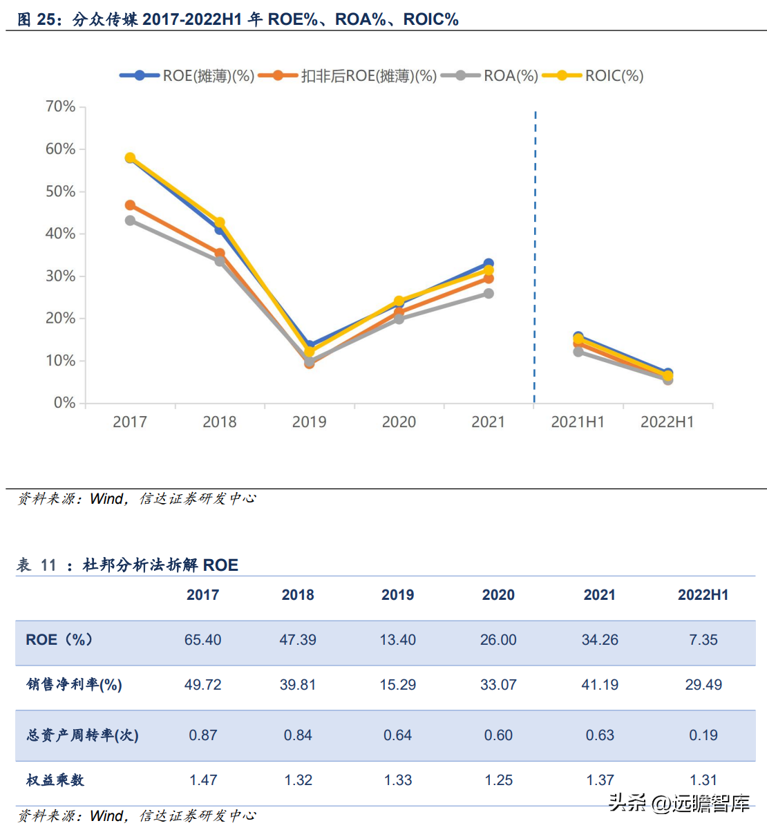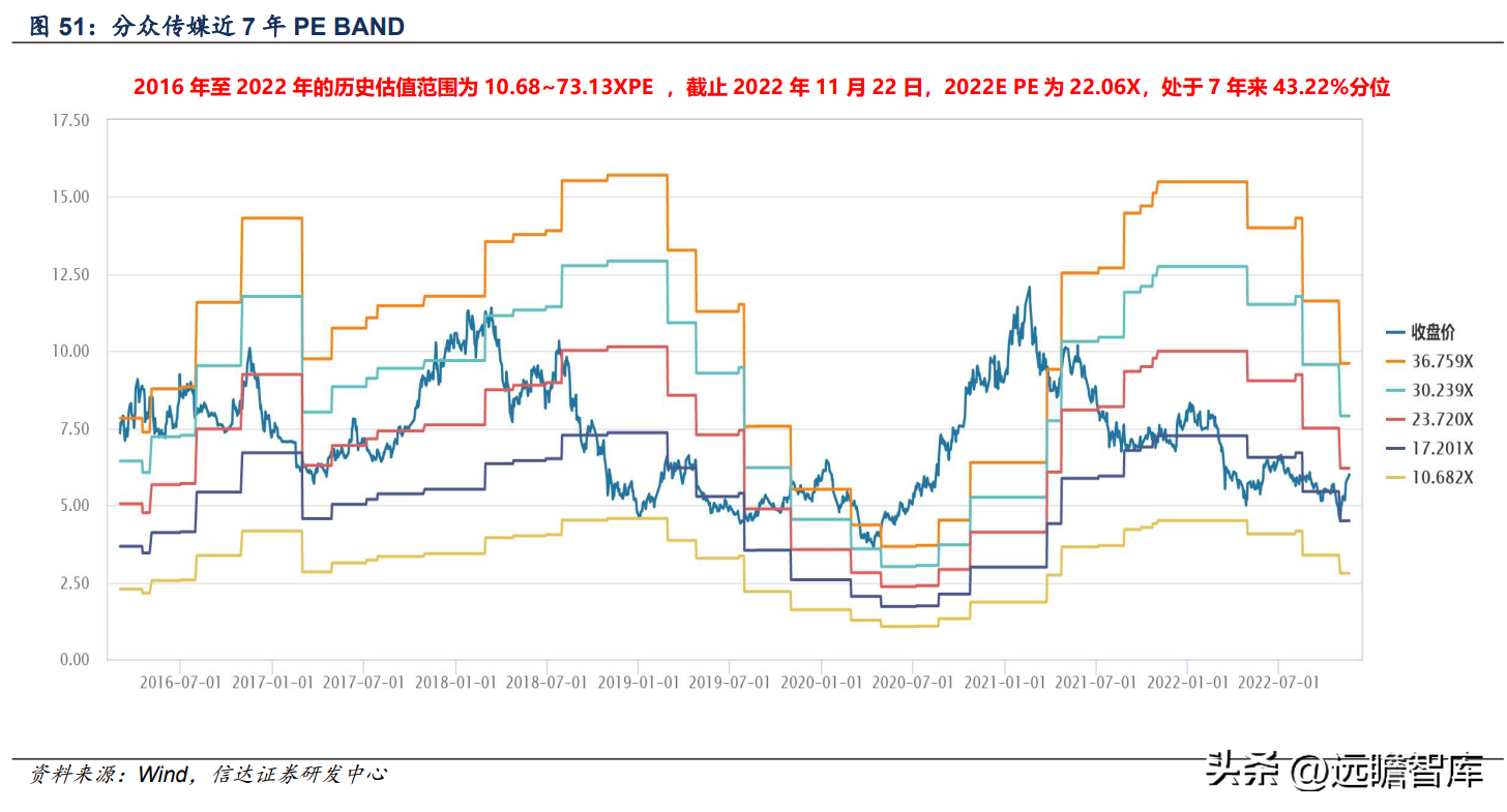 在结束不良竞争后,分众传媒专注主营业务经营, 受疫情影响,行业内竞争放缓,分众传媒持续推进降本增效战略,且受教育类等消费类行业驱动,2020 年归母净利润 40.04 亿元上升到 2021 年 60.63 亿元,ROE 由 23.5%上升到 33%,股价估值抬升,2020 年平均估值为 40~60XPE。