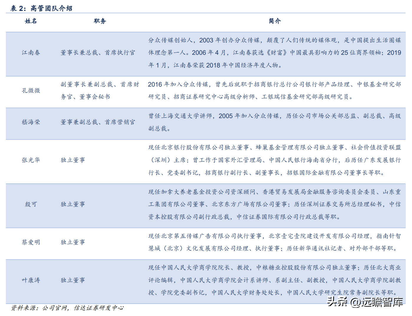 公司高管团队经验丰富,创始人江南春为公司董事长兼总裁、首席执行官,孔微微担任副董事长兼副总裁、首席财务官及董事会秘书,嵇海荣担任董事兼副总裁、首席营销官。