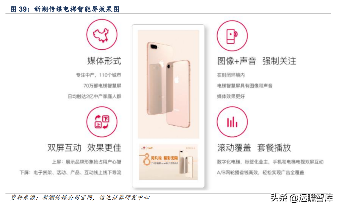 分众媒体形式主要包括楼宇媒体(包含电梯电视媒体和电梯海报媒体)、影院银幕广告媒体和终端卖场媒体等,新潮主要媒体形式是梯内电梯智能屏、纯商务网联播网、牛框框电梯海报;“梯内+梯外”、“视频+平面”组合。其中,新潮的电梯内智慧屏是“图像+声音”形式,位于电梯的封闭环境内。
