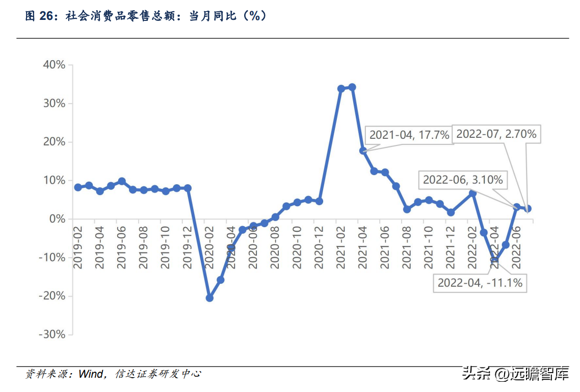 2022 年 3 月起,深圳、上海等地疫情不断,对宏观经济带来不利影响,3 月至 5 月社会消 费品零售总额当月同比值均为负,4 月同比下滑达到 11.1%,对比去年同期,整体情况较 差。