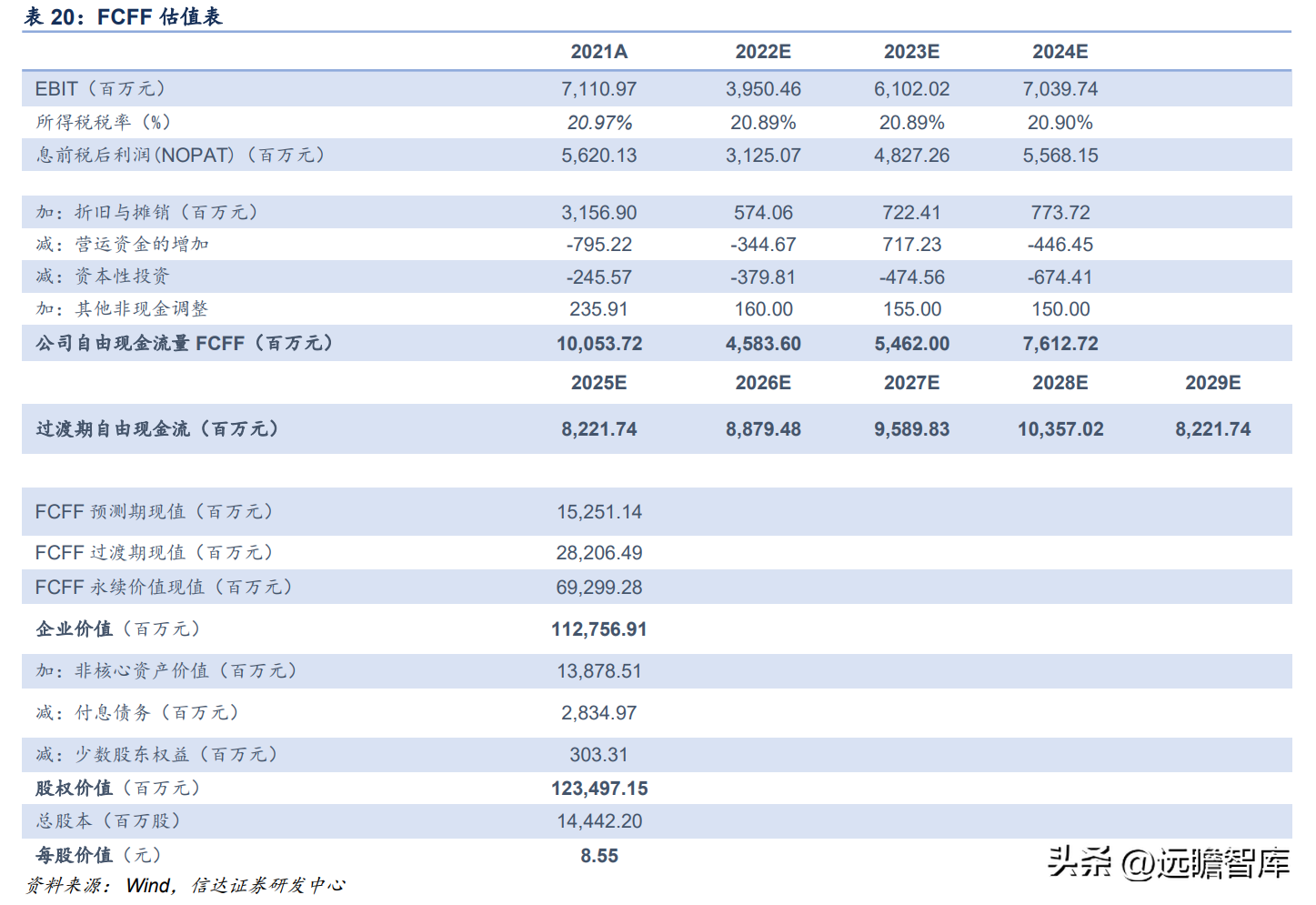 我们采用 FCFF 估值法检验,依据盈利预测,我们计算得到公司未来三年的自由现金流,假设 WACC 值为 10.47%,得到该估值法下公司目标价为 8.55 元/股,对应市值为 1234.97 亿元。综上,结合历史估值法和 FCFF,我们给予目标价区间是 6.6-8.55 元/股。
