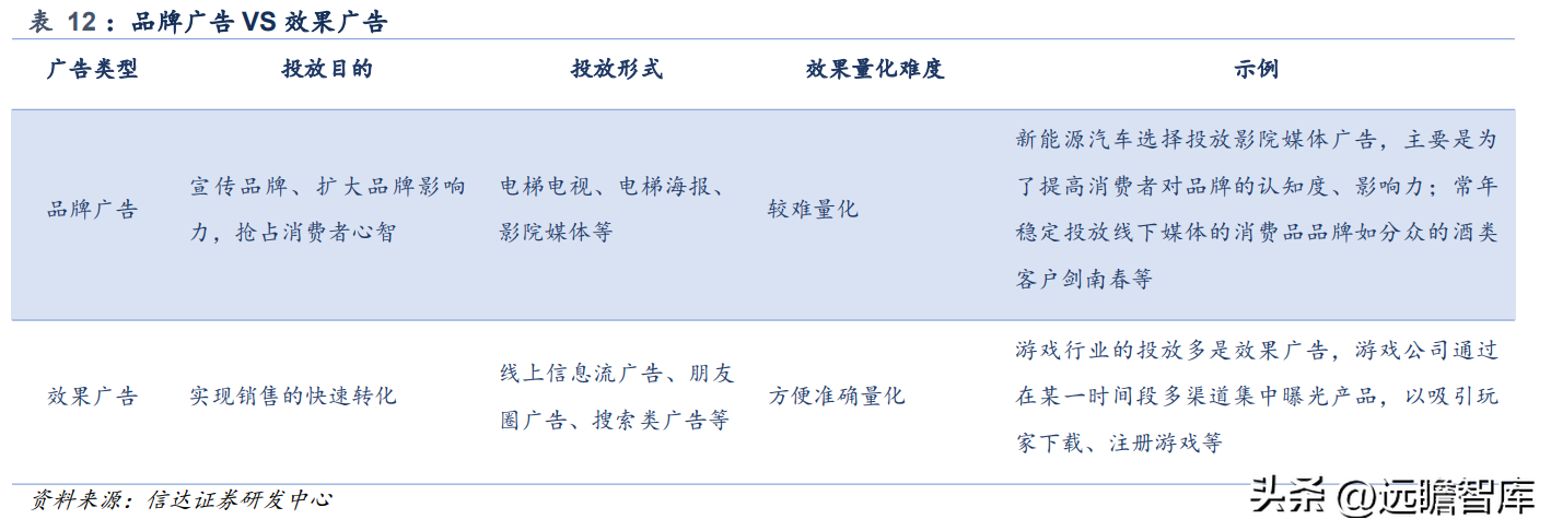 广告主投放品牌广告一般是为了宣传品牌、扩大品牌影响力、提高品牌市占率,使消费者在有需要时能第一时间想到自己的品牌,偏向“长线”效果,重点关注长期竞争力;而效果广告的投放则目标直接,快速激发消费者立刻下单的行为,偏向“短线”效果,重点是短期占有率。