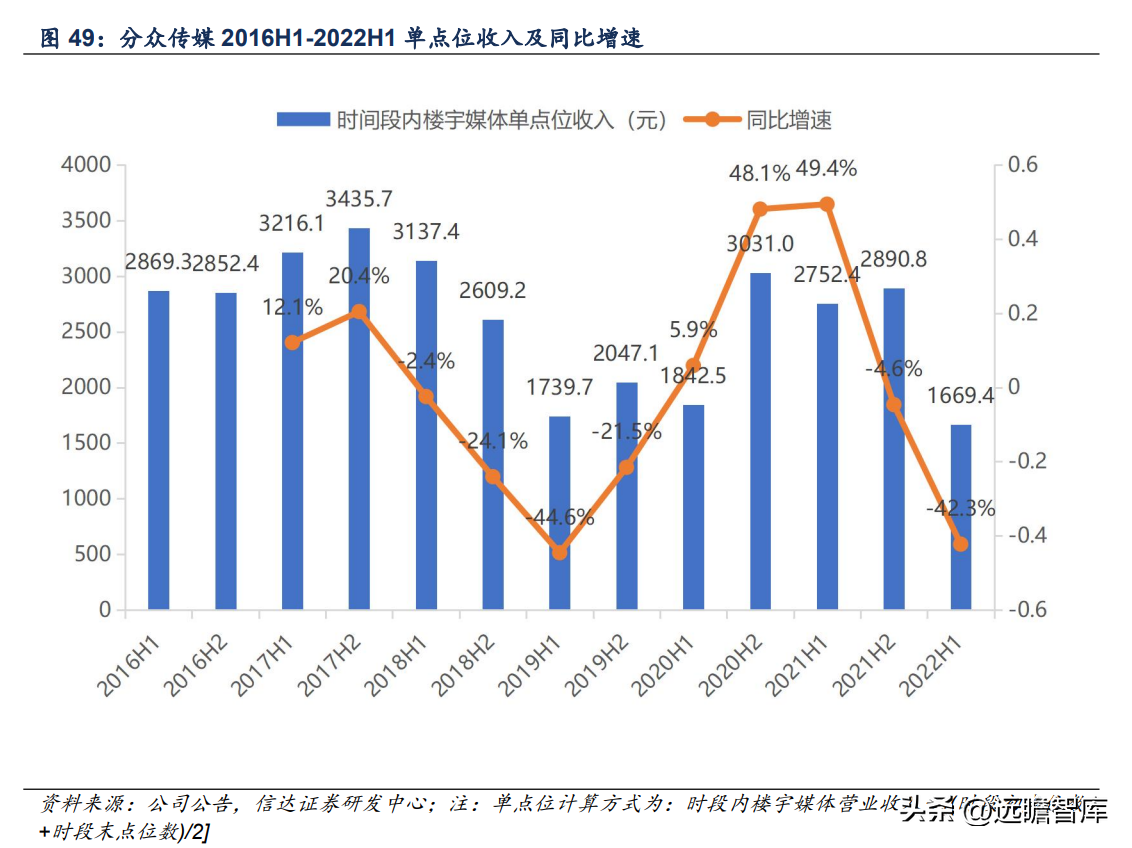 整体自 2020H1 起为上升趋势,22Q2 主要系公司剔除了一些不方便将纸质海报更换为数码海报的老旧小区低效点位,便于公司对覆盖的点位进行有效数字化管理和监测。21H2 单点位收入同比略微下降,我们认为主要系下半年宏观波动,复苏力度小于 21H1,21Q4 行业增长乏力。22H1 公司收入受疫情影响承压影响单点位收入,但我们认为不影响公司单点位收入长期上升趋势。