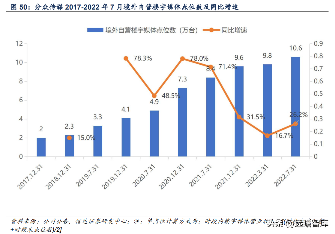 境外点位数量从 2019 年起开始高速增长,截至 2022 年 7 月 31 日,公司自营的境外电梯 电视媒体设备约 10.6 万台。