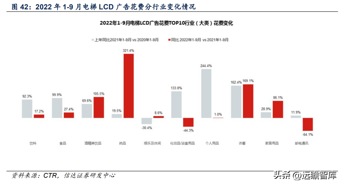 2022 年 9 月广告市场花费环比正增长 3.3%,已开始逐步回暖,另 2022 年 1~9 月户外广告花费头部行业中,食品、饮料、药品、酒精类饮品和衣着行业在多个广告渠道呈现明显增长,食品行业在电梯 LCD 和电梯海报的花费同比分别上涨 27.4%和 61.8%,酒精类饮品行业在各户外广告渠道均有不同程度的增投,在电梯 LCD 和影院视频表现较抢眼,广告花费分别上涨 105.5%和 38.8%。
