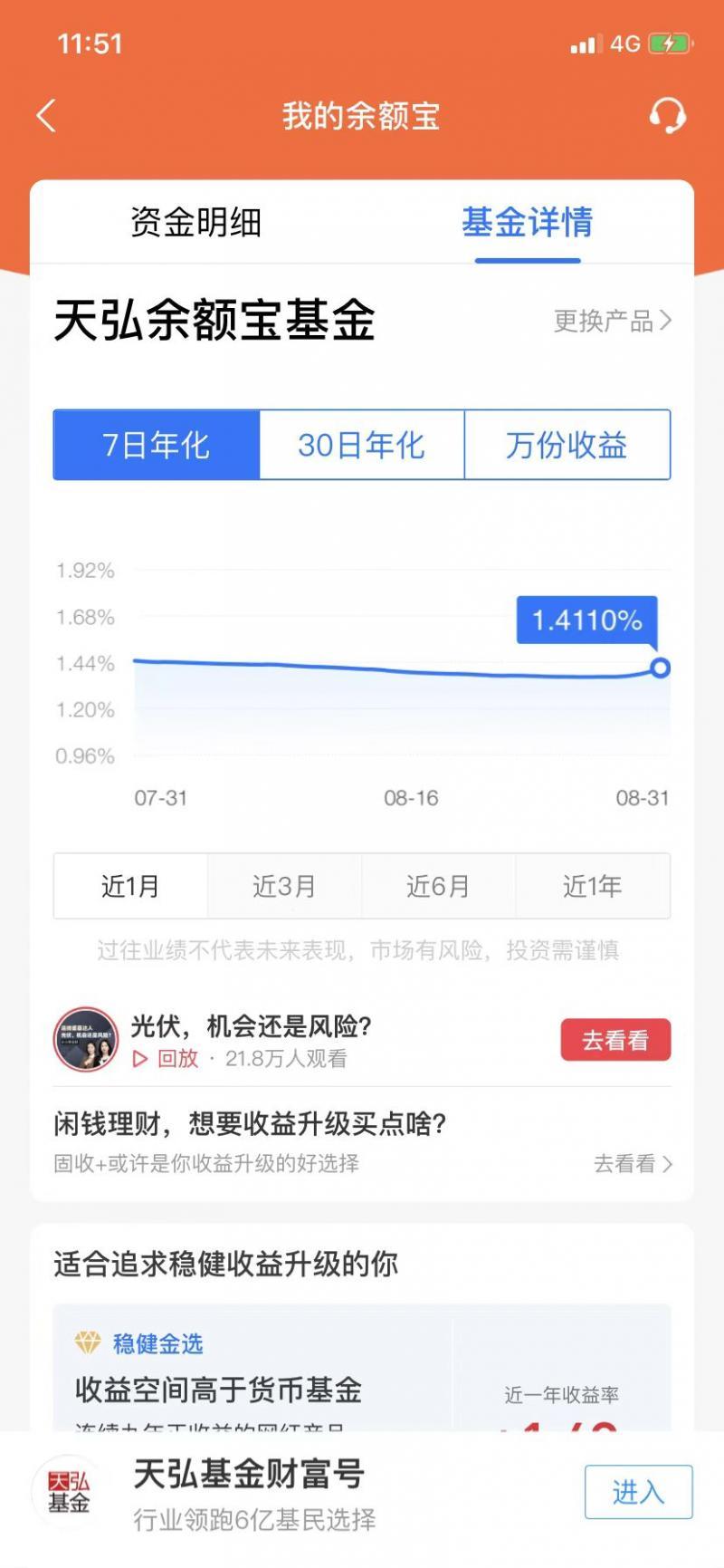 进入8月份以来,天弘余额宝7日年化收益率持续走低,截至8月31日,7日年化收益率低至1.4110%,1万元存一年,收益还不到150元,仅约141元。而我国四大商业银行1年定期存款的利率为1.75%,相比之下,“国民理财神器”在收益方面的优势已经不大明显。