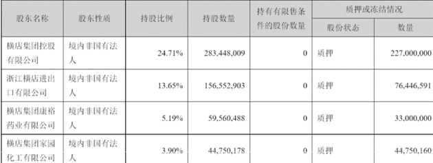 同时,浙江横店进出口有限公司、横店集团康裕药业有限公司、横店集团家园化工有限公司是横店控股的一致行动人。这3家公司也存在质押大量普洛药业股份的情况,质押比例分别为48.83%、55.41%、100.00%。