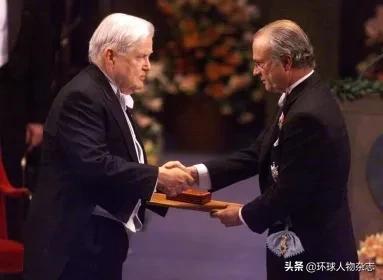 在瑞典斯德哥尔摩的诺奖颁奖宴会上,他身穿燕尾服,打着白色领结,从瑞典国王卡尔十六世手上接过奖状和奖章。