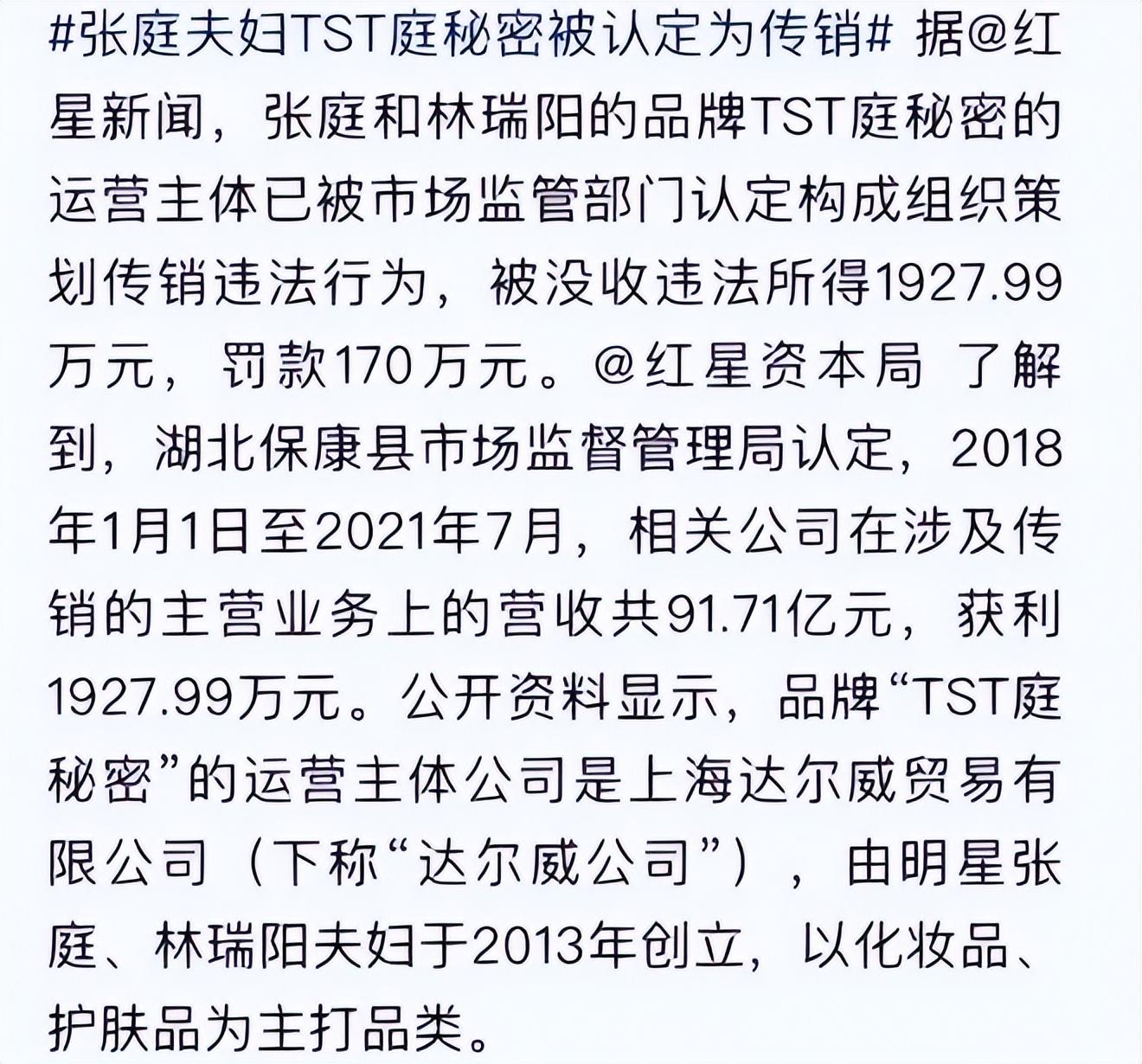 石家庄裕华区的市场监管局发文揭露了张庭夫妇创建的公司——达尔威公司,涉嫌网络传销。冻结了多达6亿件财产。名下豪宅亦遭查封,竟多达96间,价值更远远超过17亿。