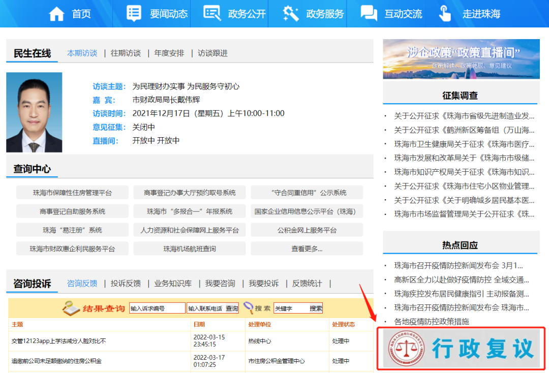 1. 复制下方网址,访问珠海市人民政府门户网站互动交流栏目,点击“行政复议”: