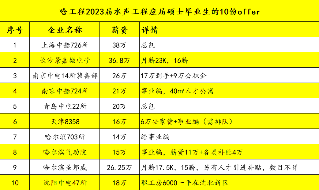 本篇仅以一位投稿的哈工程2023届水声工程的应届硕士毕业生为例,这名2023届硕士毕业生同学目前共拿到了10个offer,其中8家是研究所,2家是民营企业,一起分享来看看。