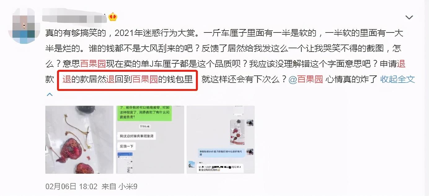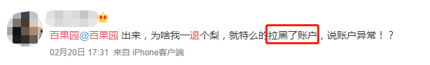 ,有说不退钱的,有说退钱只是退回百果园钱包的,也有说申请退款就被拉黑账户的——说被拉黑的人最多,这也最匪夷所思,线上流量那么重要,你说拉黑就拉黑了?