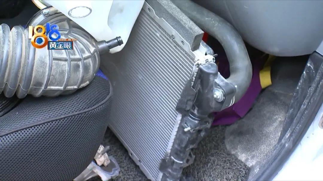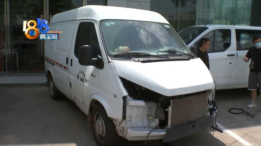 这辆车目前停在杭州临安美福江铃4S店的门口,何师傅希望销售方能积极协助解决问题。车辆前保险杠已经被拆掉,发动机外侧裸露。陈先生拿出一根皮带,