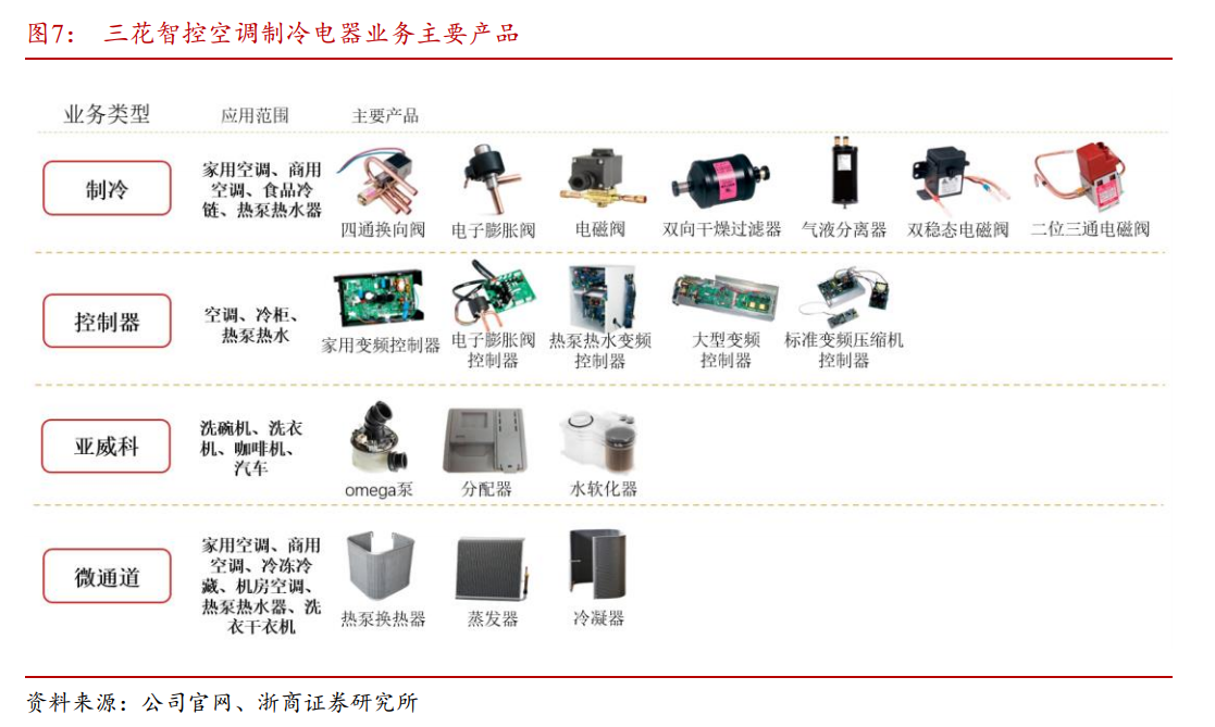空调冰箱电器零部件业务致力于建筑暖通、电器设备专业化经营,主要产品包括四通换向阀、电子膨胀阀、电磁阀、微通道换热器、Omega泵等,广泛应用于空调、冰箱、冷链物流、洗碗机等领域;汽车零部件业务专注于汽车热管理领域的深入研究,主要产品包括热力膨胀阀、电子膨胀阀、电子水泵、新能源车热管理集成组件等,广泛应用于新能源汽车和传统燃油车。