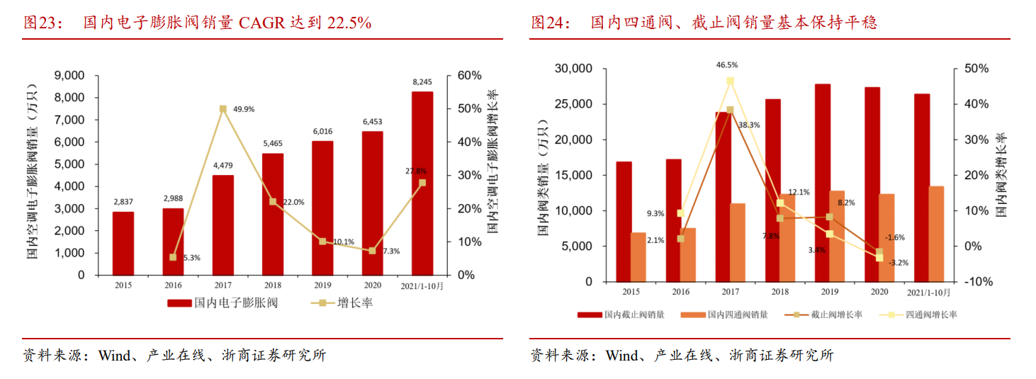 变频空调和冰箱等对冷媒流量控制精度要求较高,国家政策对能效等级的要求也越来越严格。而电子膨胀阀相比于热力膨胀阀,具有响应快、控制精度高等优点,使各大厂商在能效比提高的路径上,逐渐采用电子膨胀阀替代热力膨胀阀,电子膨胀阀的节能优势得到充分发挥。2016年国内空调电子膨胀阀销量接近3000万只,2021年截止到10月份,其销量达到8245万只,CAGR达到22.5%。
