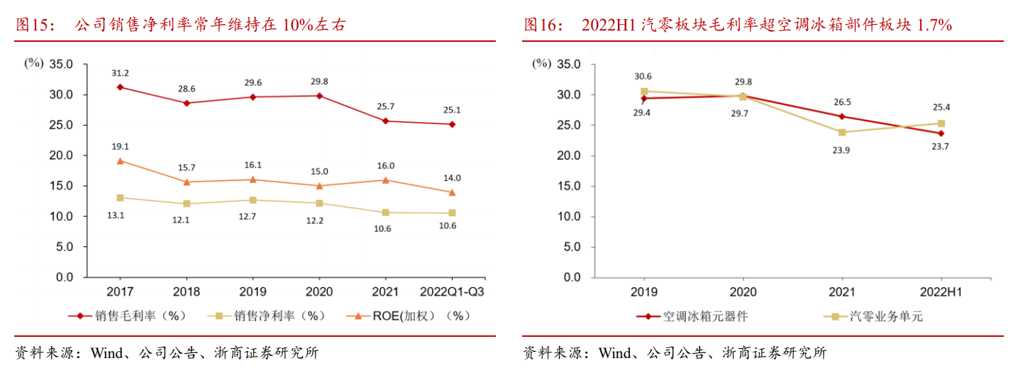 近几年,随着家电行业竞争加剧,以及汽零板块热管理行业玩家越来越多,竞争有所加剧,整体上公司毛利率有所下降,但基本仍然可以保证净利率在10%以上,展现公司具备较强韧性。