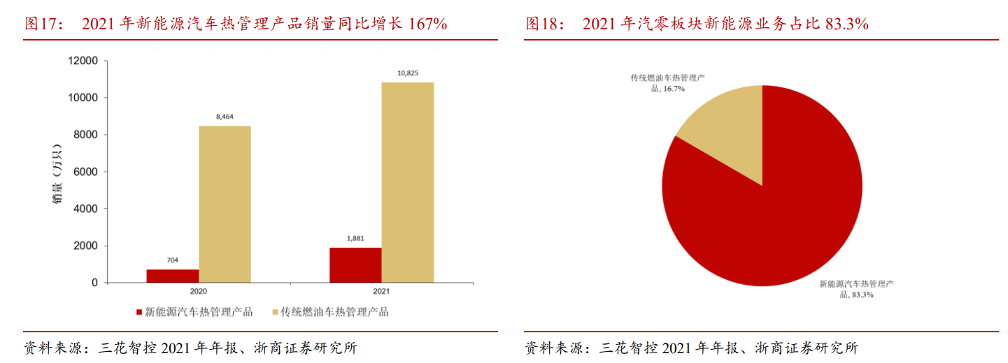 公司汽零业务板块2021年营收48亿元,同比增长94%,展现出高弹性增长趋势,目前稳居新能源汽车热管理零部件龙头地位。
