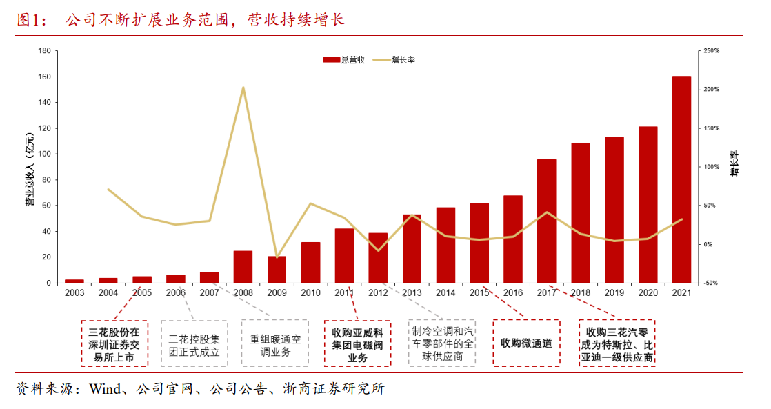 2004年,公司进入第三阶段“战略发展期”,2005年在深交所上市,接着通过整合产业,收购亚威科、微通道等公司扩展业务,并在2012年成为空调冰箱零部件和汽车零部件的全球供应商,2015年,收购三花微通道;2017年,公司收购三花汽零,正式进军新能源汽车热管理行业。