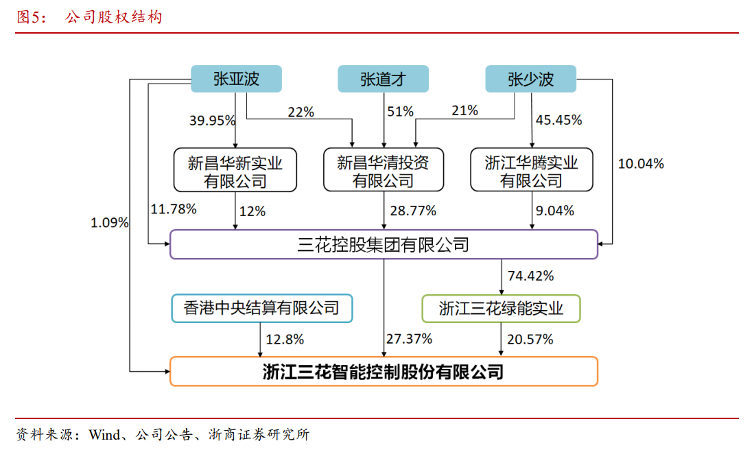 公司实际控制人为张道才、张亚波、张少波,父子三人。截止2022年11月29日,根据Wind股权穿透,父子三人共同持有三花控股集团有限公司股份比例约为57.8%,共同持有三花智控股份比例约为25.7%,为三花智控的实际控制人。公司通过不断增发融资,把握核心客户以及新能源汽车赛道,逐渐成长为汽车热管理行业核心企业。