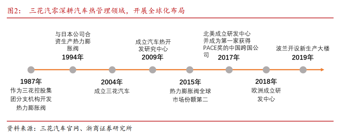 三花汽零业务板块在1987年作为三花控股集团分支机构开始开发热力膨胀阀,并在1994年与日本公司合资,在早期阶段积累核心技术;在2004年,正式成立三花汽车,将汽车零部件业务提升一个新的高度;2009年成立汽车热开发研究中心;在2015年实现全球热力膨胀阀市场份额占比第二;2017年在北美成立研发中心,并成为第一家获得PACE奖的中国跨国公司,着力进一步布局北美市场;2018年在欧洲成立研发中心,深化在欧洲市场的布局;2019年在波兰开设新生产大楼,拓宽本土生产能力。