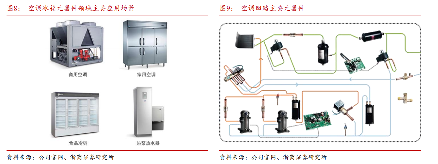 空调冰箱电器类零部件主要应用于家用和商用空调、食品冷链和热泵热水器等场景。