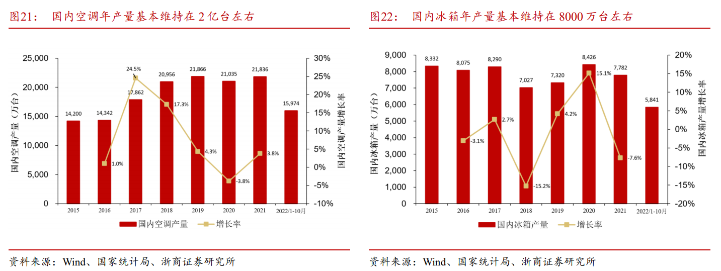 根据国家统计局数据,2021年农村每百户空调机拥有量在89台,城镇家庭每百户空调机拥有量为161.7台,仍然有一定的增长空间。2020年到2021年,国内冰箱产量基本维持在8000万台左右。近几年由于疫情影响,整体宏观环境不佳,国内冰箱产量走势表现并不是很强,但整体产量保持稳定。