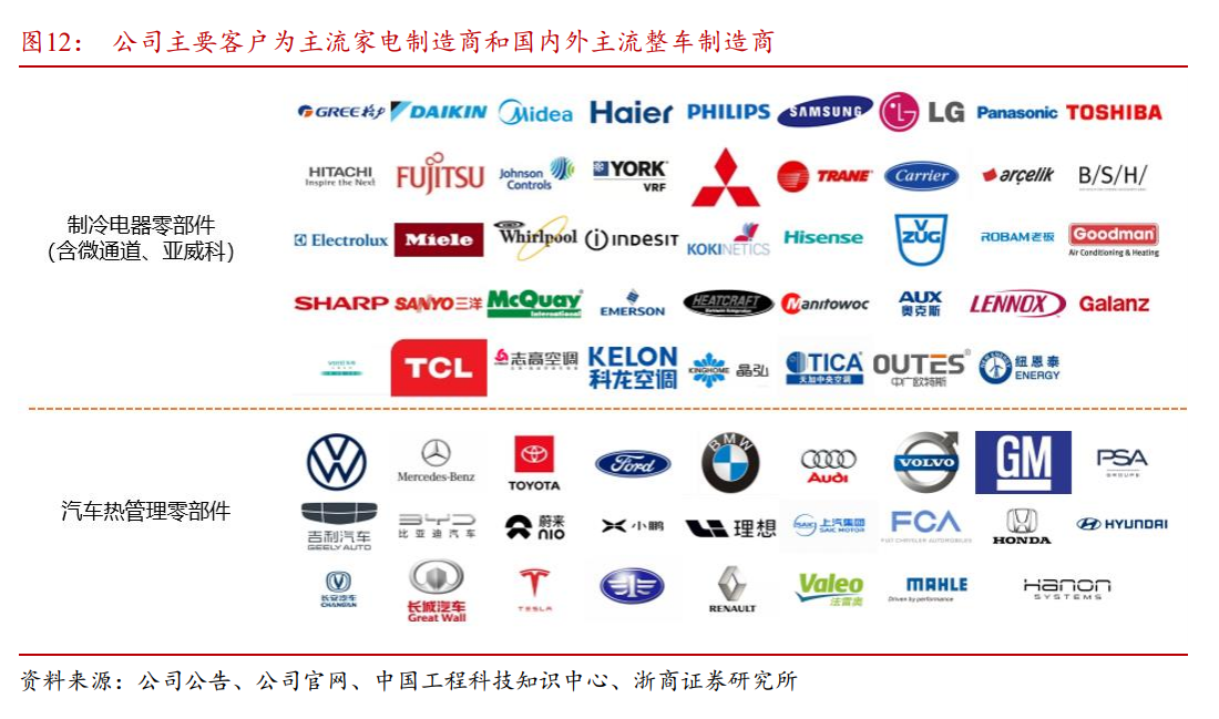在制冷板块,主要客户为国内主流家电制造商,如美的,格力,海尔,三星,LG,奥克斯等。在汽零板块,公司主要客户为国内主流整车厂以及海内外主流零部件供应商。