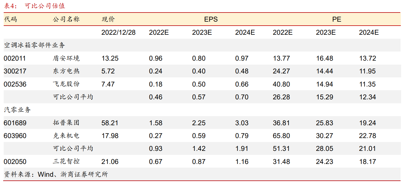 汽零业务板块,公司主要业务为新能源汽车热管理,选取拓普集团、克来机电作为可比公司,2023年平均PE约为28倍。